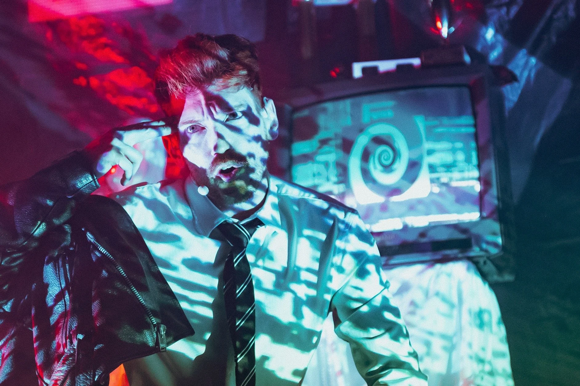 I DESIGNED HEAVEN HATES ME WITH a riot of lo-fi materials — preferring crunchy crt tvs over 4k monitors, beaming graphic-driven projections as the primary light source + passing off handheld spotlights over to the fans
